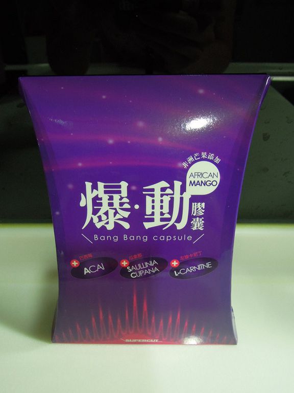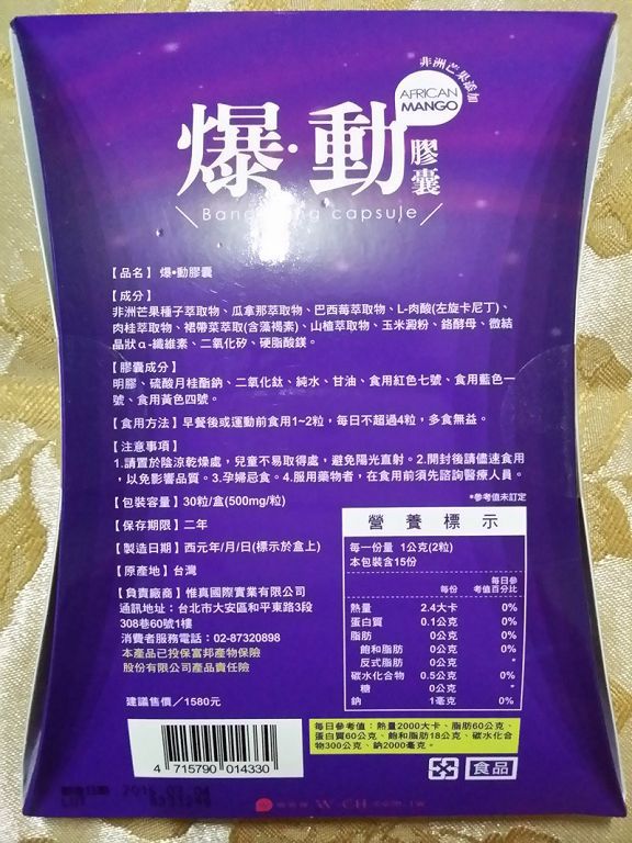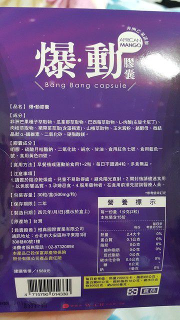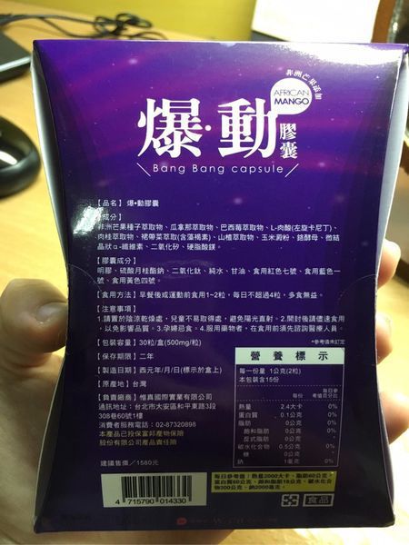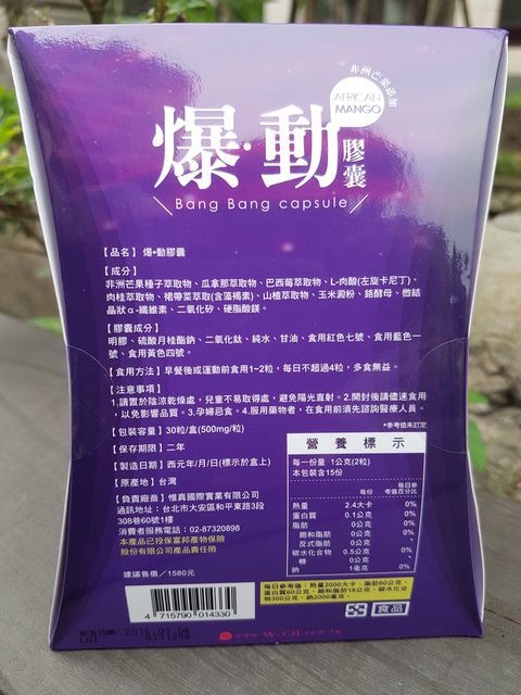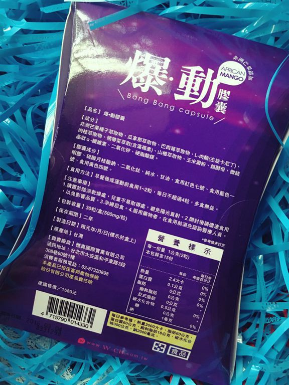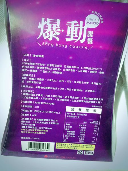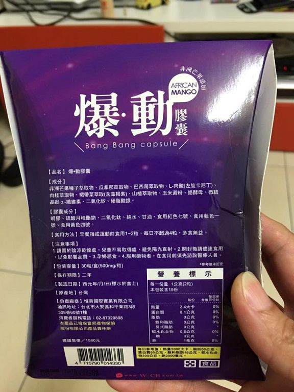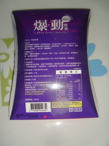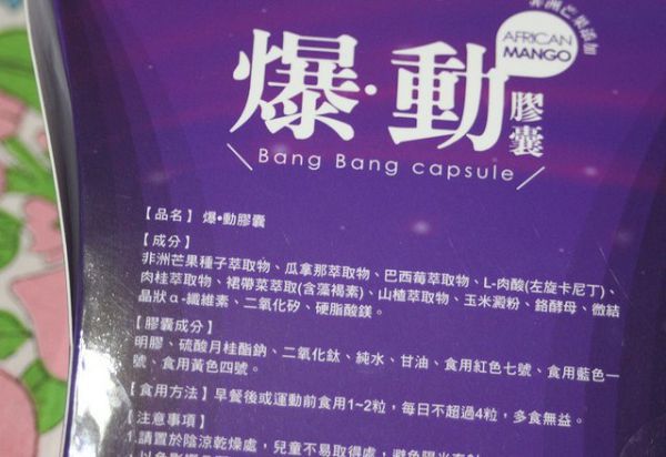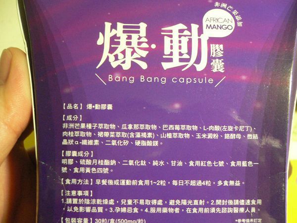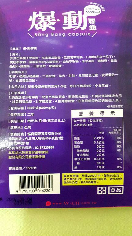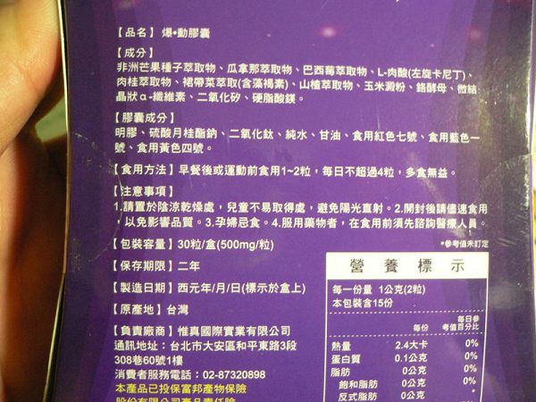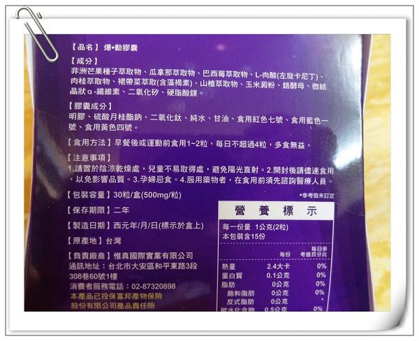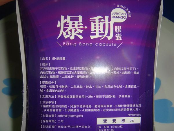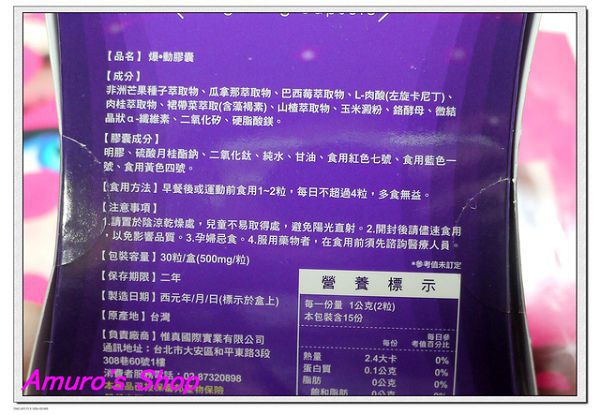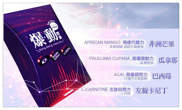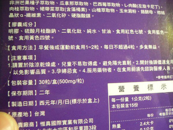 | 商品成分 | 非洲芒果種子萃取物、瓜拿那萃取物、巴西莓萃取物、L-肉酸(左旋卡尼丁)、肉桂萃取物、裙帶菜萃取(含藻褐素) 、山楂萃取物、玉米澱粉、鉻酵母、微結晶狀α-纖維素、二氧化矽、硬脂酸鎂。 |