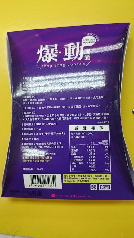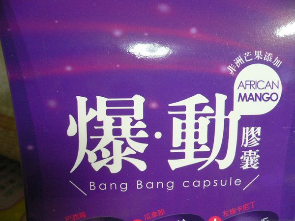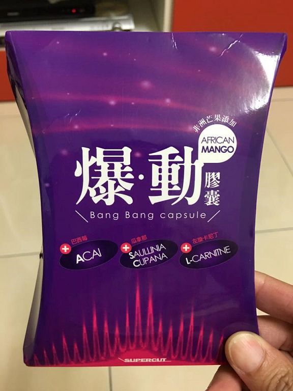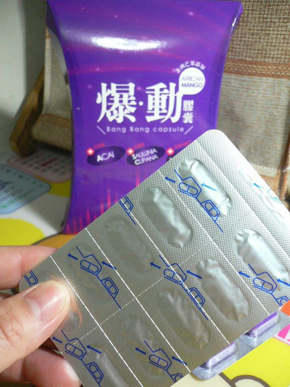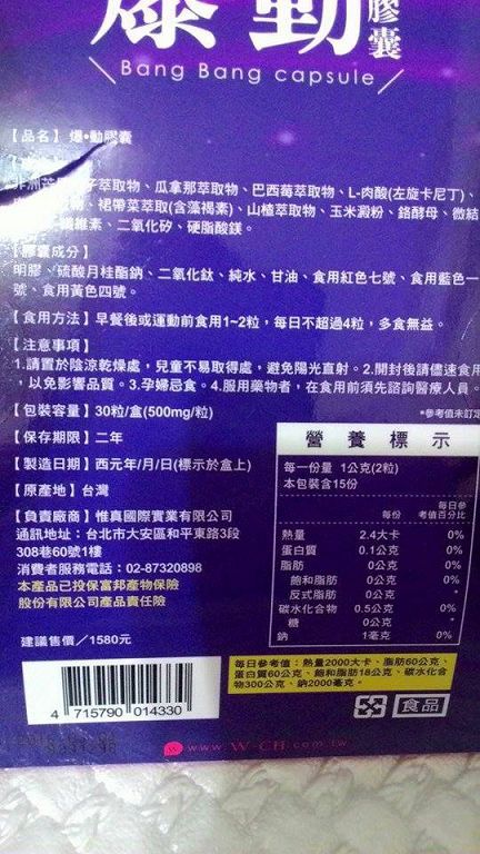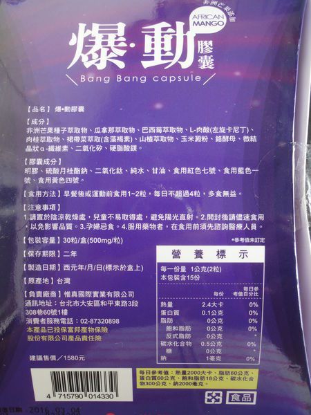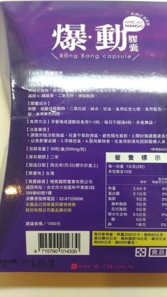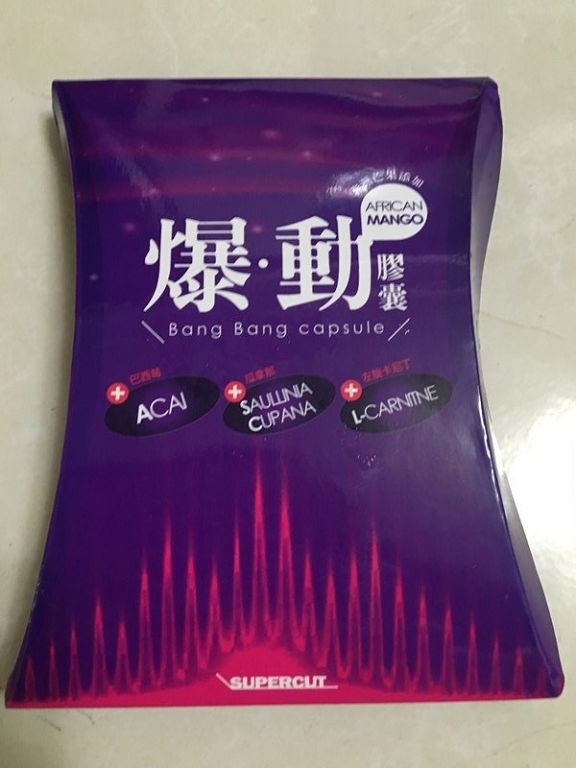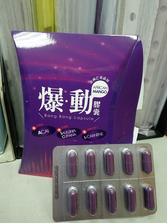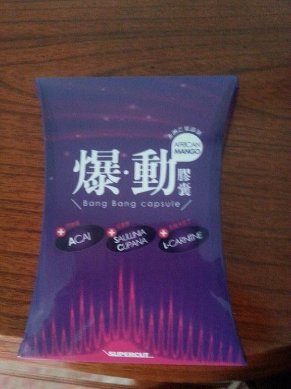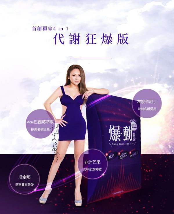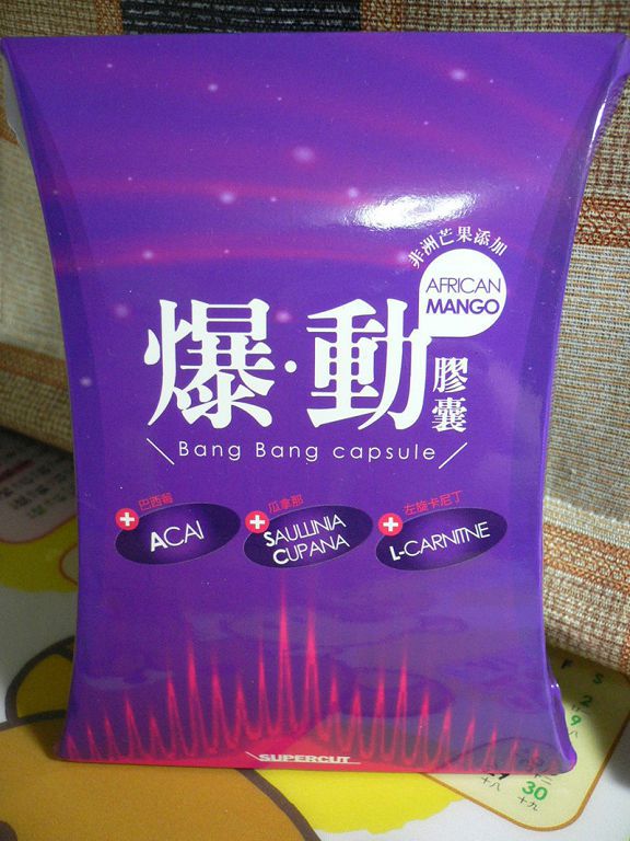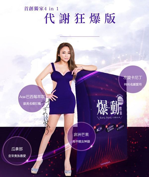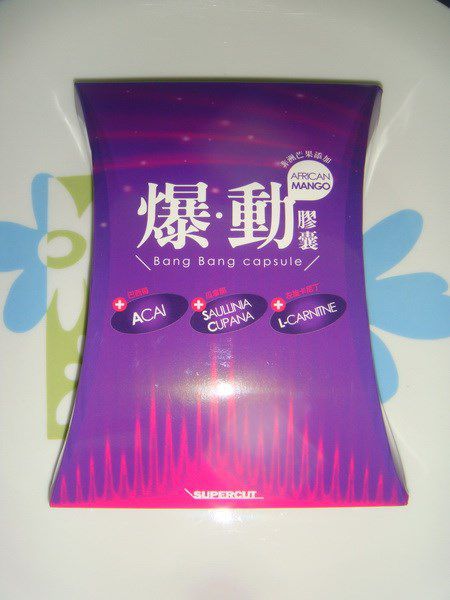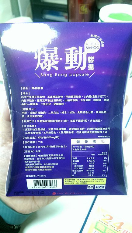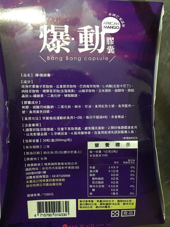 | 商品成分 | 非洲芒果種子萃取物、瓜拿那萃取物、巴西莓萃取物、L-肉酸(左旋卡尼丁)、肉桂萃取物、裙帶菜萃取(含藻褐素) 、山楂萃取物、玉米澱粉、鉻酵母、微結晶狀α-纖維素、二氧化矽、硬脂酸鎂。 |