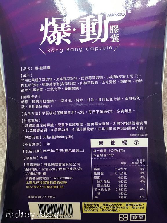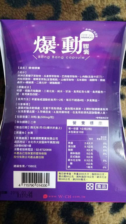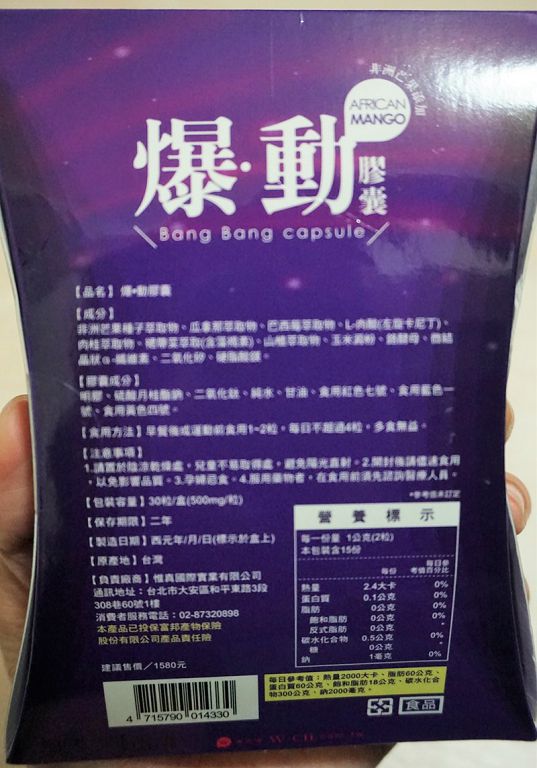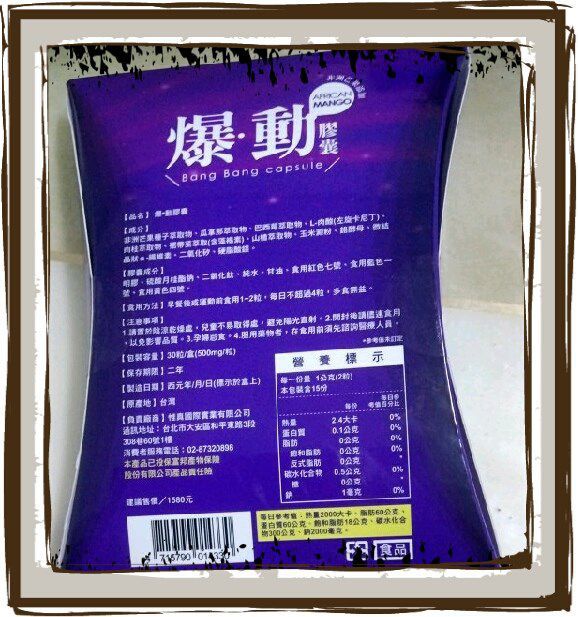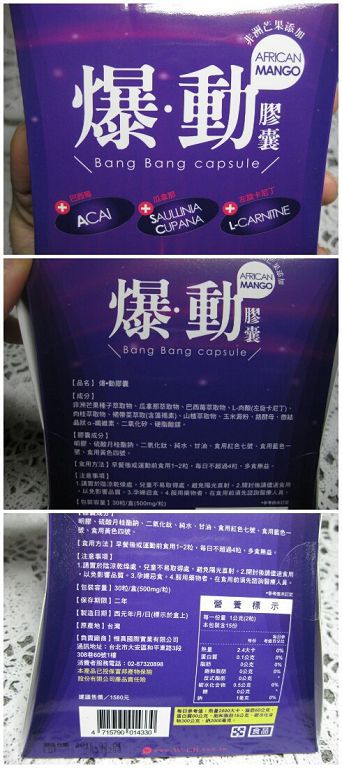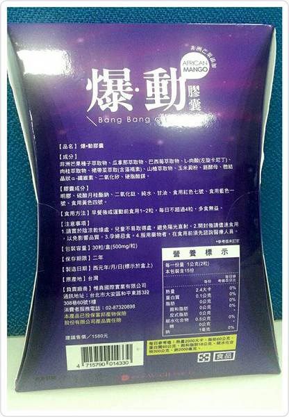 ▲ 成分標示,其中它們最主打的就是非洲芒果,甜蜜上網查詢後發現,於臨床研究中使用的真正非洲芒果提取物(Irvingia gabonensis)標準化為7%的白蛋白(水溶性蛋白)根據臨床測試所使用的劑量釐定 多樣化效果 燃燒脂肪和減少脂肪的形成、延緩飯後碳水化合物的吸收、幫助控制飢餓感和食慾~不過它們並不是只有非洲芒果還有 巴西莓/瓜拿那/左旋卡尼丁 。