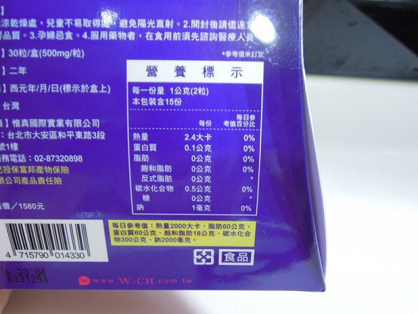 淨重、容量:500mg/粒,30粒/盒