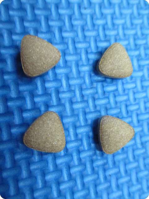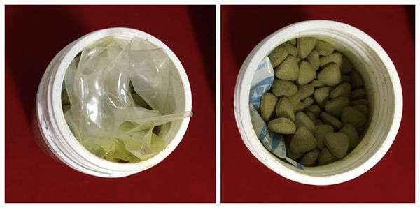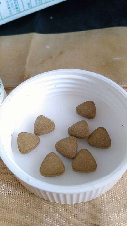 取出並傾倒,裡面是一顆顆小小的綠色三角形錠劑!!