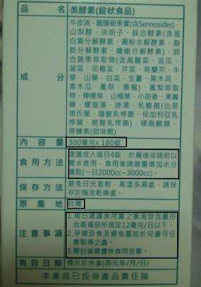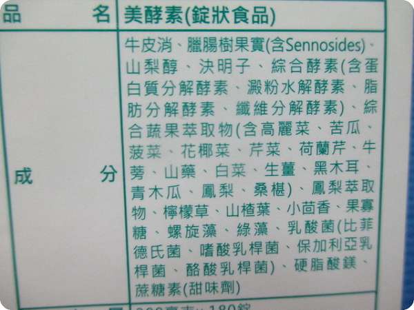 【內容物成份】 牛皮消、臘腸樹果實(含Sennosides)、山梨醇、決明子、綜合酵素(含 蛋白質 分解酵素、澱粉水解酵素、脂肪分解酵素、纖維分解酵素)、綜合蔬果萃取物  (含高麗菜、苦瓜、菠菜、花椰菜、芹菜、荷蘭芹、牛蒡、山藥、白菜、生薑、  黑木耳、青木瓜、鳳梨、桑椹)、鳳梨萃取物、檸檬草、山楂葉、小茴香、果  寡糖、螺旋藻、綠藻、乳酸菌(比菲德氏菌、嗜酸乳桿菌、保加利亞乳桿菌、  酪酸乳桿菌)、硬脂酸鎂、蔗糖素(甜味劑)。