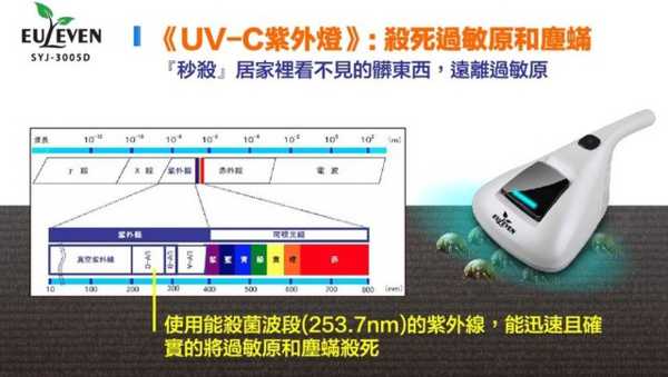 2. UV-C紫外燈,使用能殺菌波段253.7nm紫外線,迅速且確實的將塵蟎及過敏原殺死