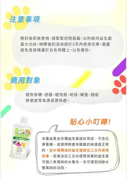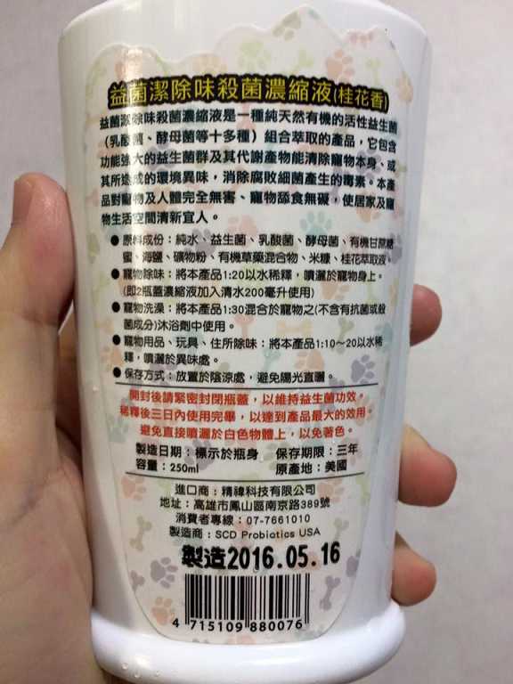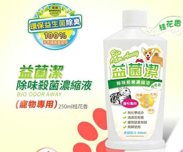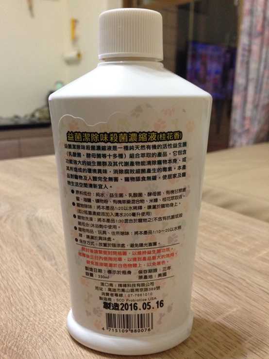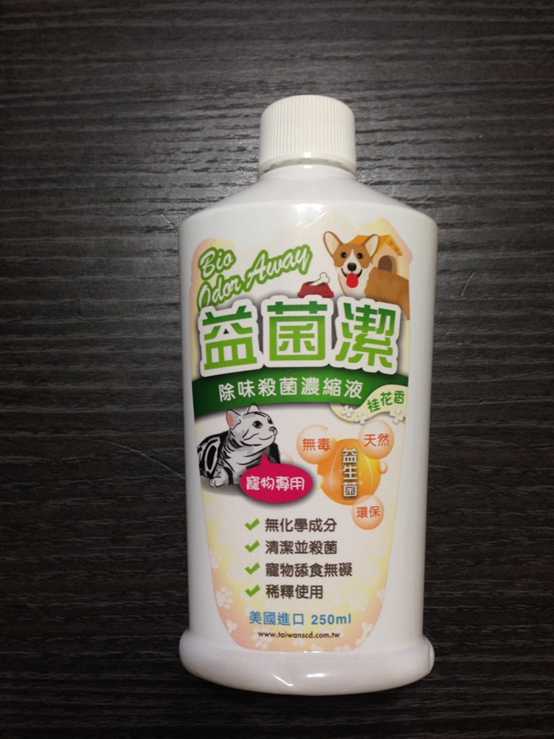 而益菌潔不用擔心這個問題,寵物舔食無礙,讓我可以放心使用,益菌潔-除味殺菌濃縮液(桂花香)是一種純天然有機的生活性益生菌(乳酸菌、酵母等十多種)組合萃取的產品,