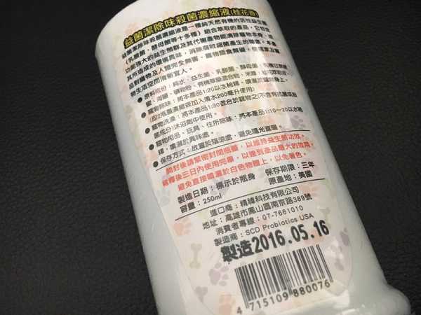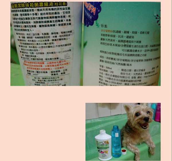 讓我家兩隻寶貝可以香香一整天不怕細菌,這次想要索取『益菌潔-除味殺菌濃縮液』是因為我發現益菌潔與其他廠牌的狗狗沐浴乳不一樣,而且益菌潔有四大特點很吸引我,第一無化學成份 第二清潔並殺菌 第三寵物舔食無礙 第四稀釋使用 ,光是這幾點就比一般狗狗沐浴乳厲害多了,