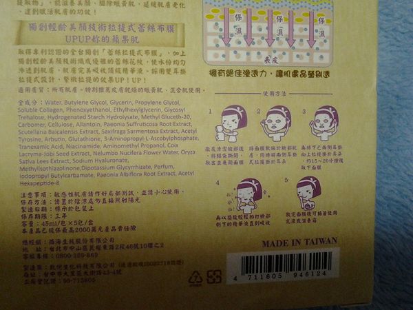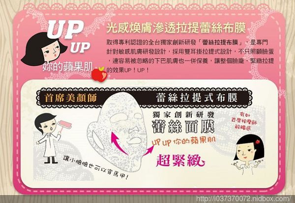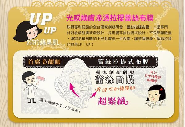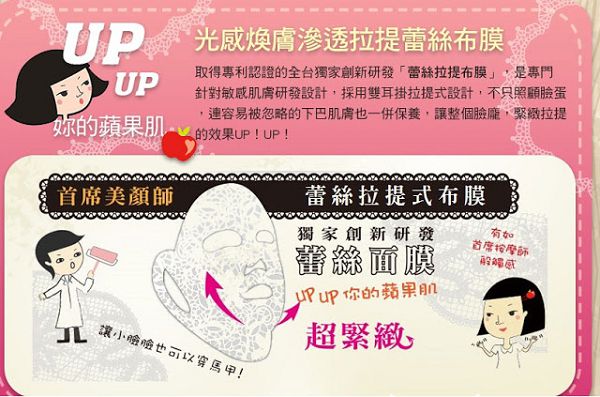 面膜是雙耳掛拉提式的設計,能緊緻拉提臉部,讓肌膚達到UP!UP!
