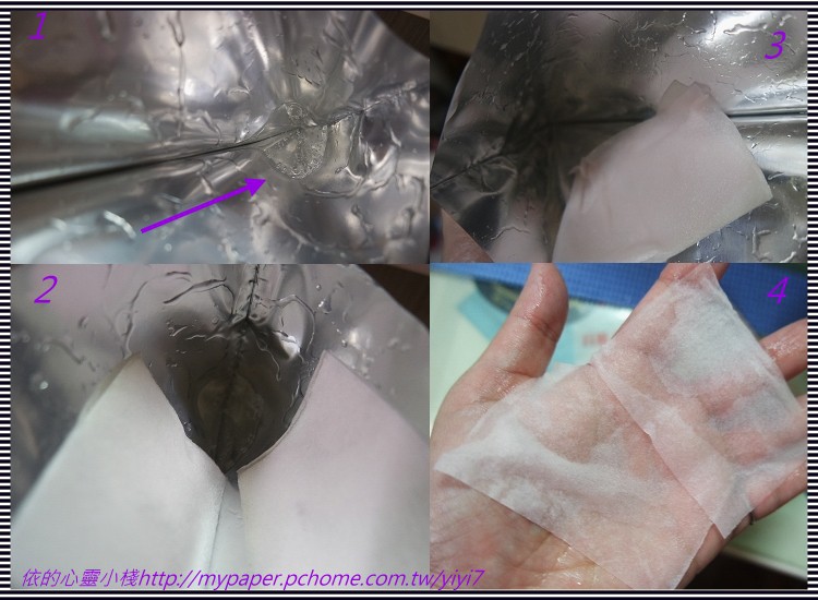 1. 徹底清潔臉部後,將鋁袋撕開,取出並展開面膜