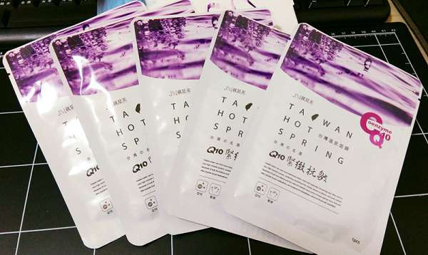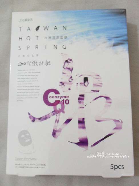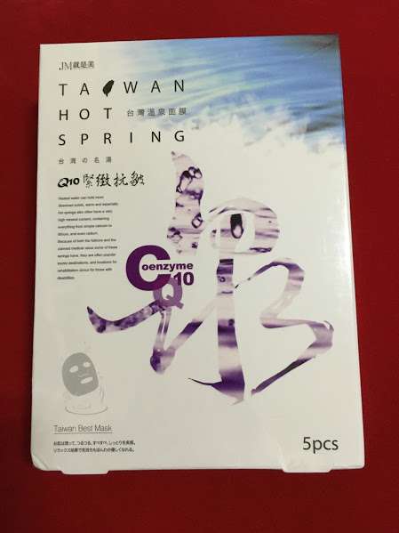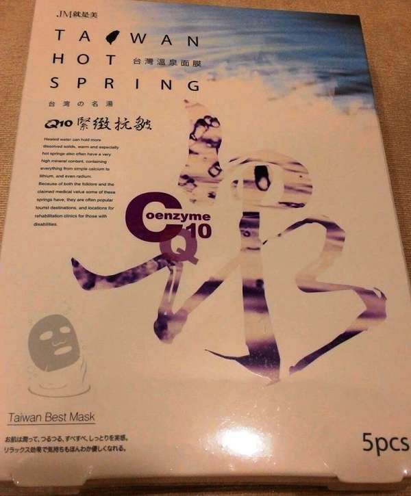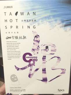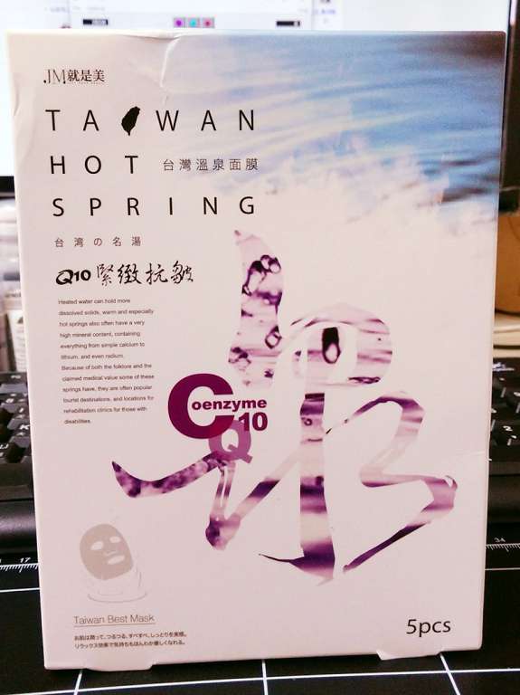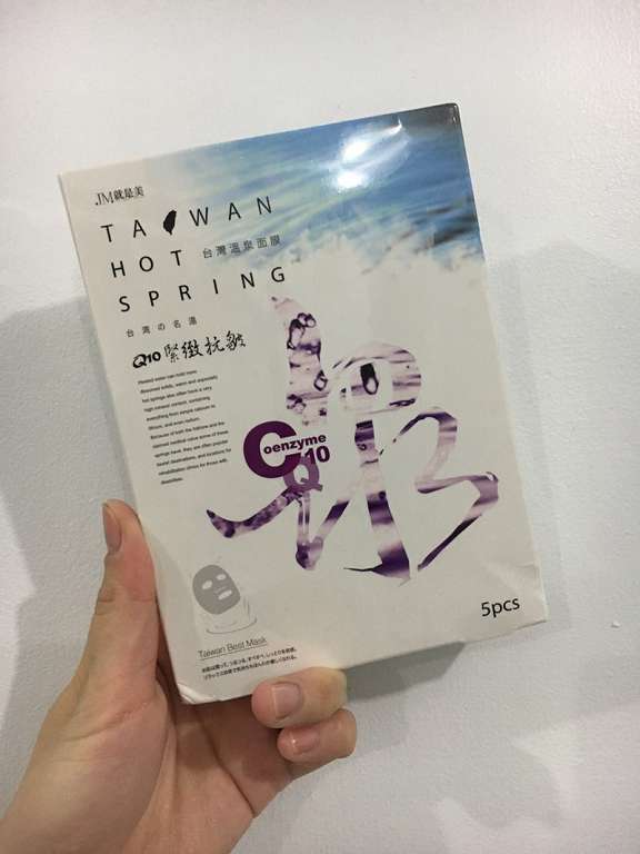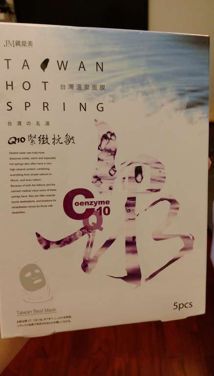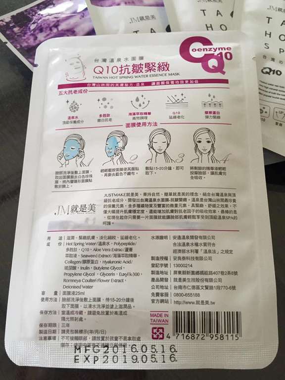JM就是美台灣溫泉水面膜一共有三種:Q10抗皺緊緻、虎頭蘭保濕淨白、蝸牛補水修護,我拿到的是Q10抗皺緊緻。JM就是美台灣溫泉水面膜Q10抗皺緊緻含有五大抗老成份:溫泉水、多胜肽、海藻萃取精華、Q10和膠原蛋白,可以滋潤、緊緻肌膚,淡化細紋、延緩老化。
