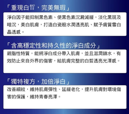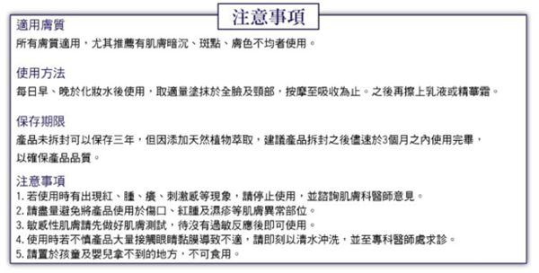 →改善膚色不勻現象:含高穩定性及持久性淨白成份,能降低黑色素形成