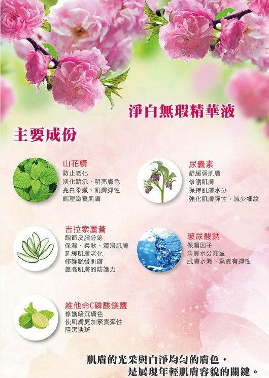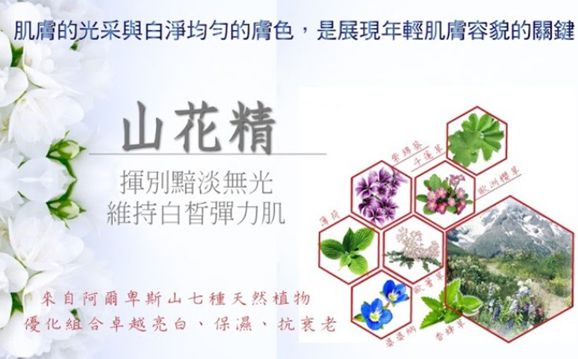 還有山花精及博尿酸,能讓皮膚快速美白及鎖住成分