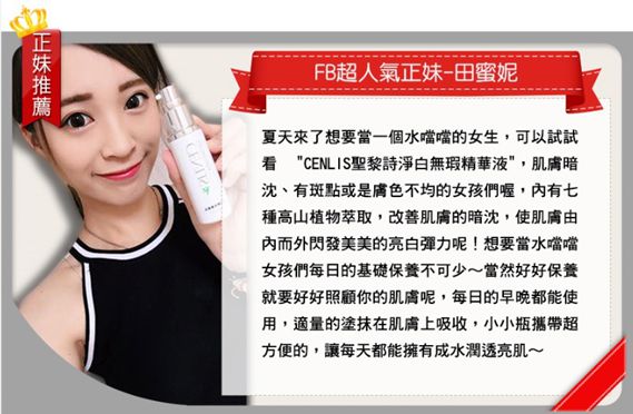 夏日破表的紫外線讓你感到害怕嗎?別忘了跟我一起來使用CENLIS聖黎詩淨白無瑕精華液,讓我們一起淨白無瑕這個炎夏吧!