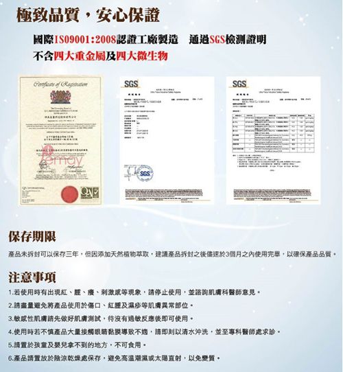 主要成份:古拉索蘆薈萃取、尿囊素、山花精、玻尿酸鈉、維他命C磷酸鎂鹽