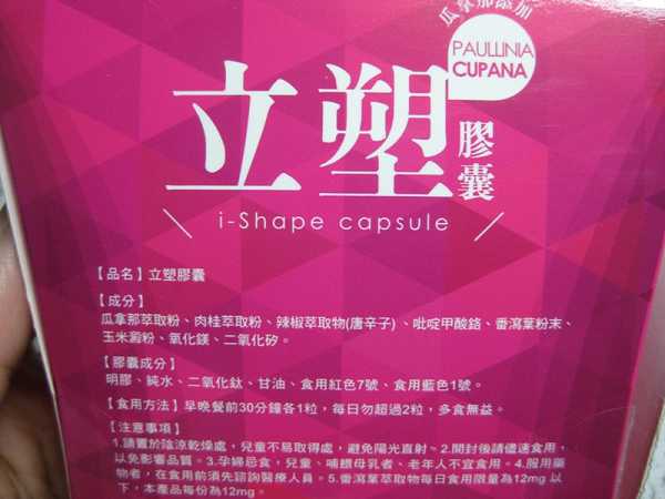Supercut塑魔纖立塑膠囊的成分有:瓜拿那萃取粉、肉桂萃取粉、辣椒萃取物(唐辛子)、吡啶甲酸鉻、番瀉葉粉末、玉米澱粉、氧化鎂、二氧化矽。