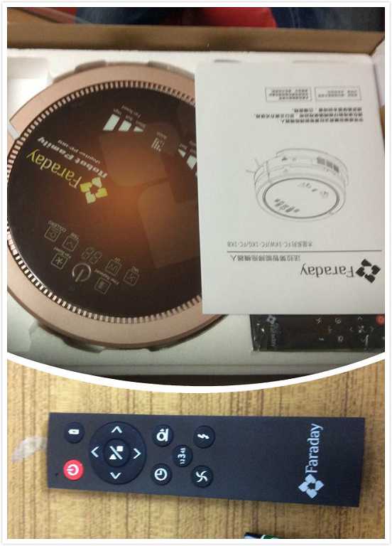 接下來打開第二層看到的是遙控器和法拉第FARADAY3D潔淨機器人上層的移動式的空氣清淨機