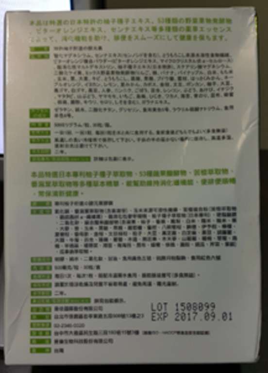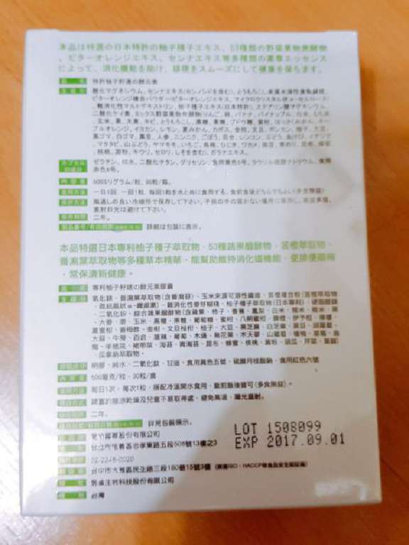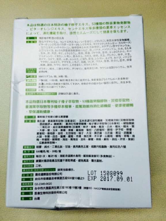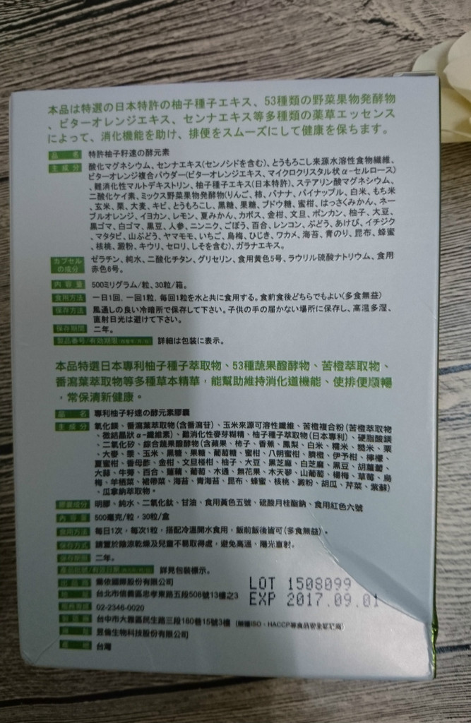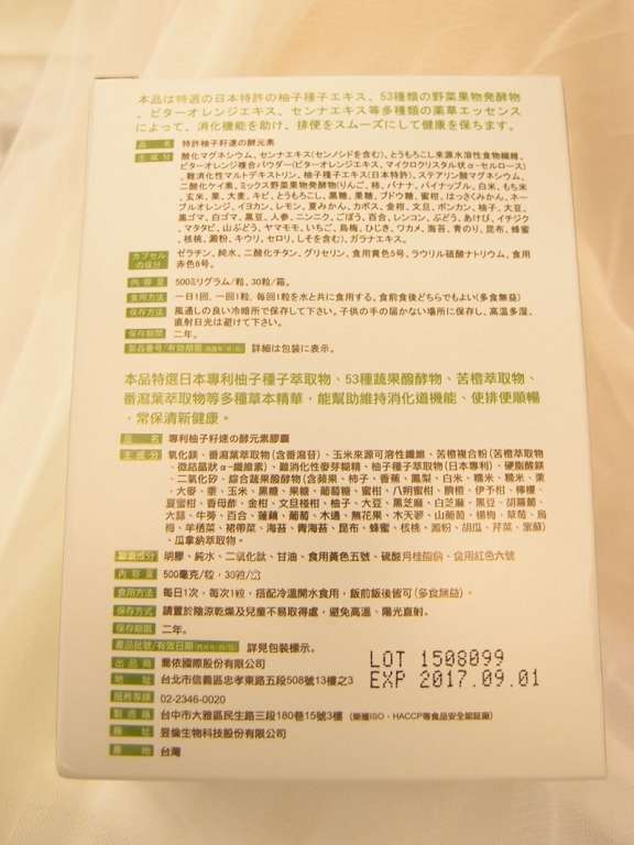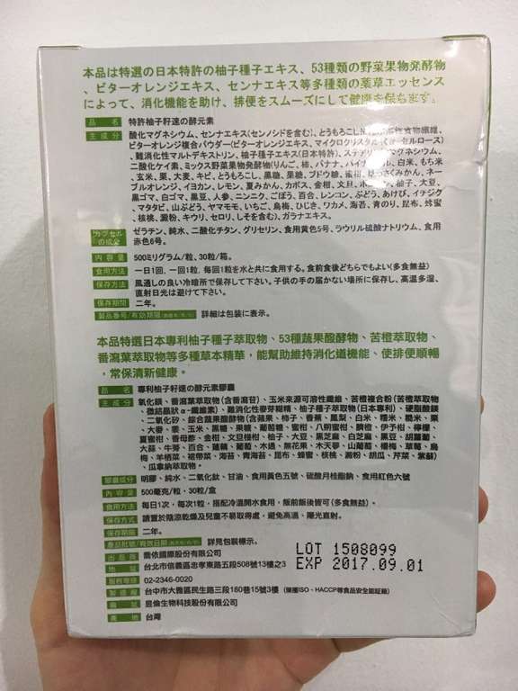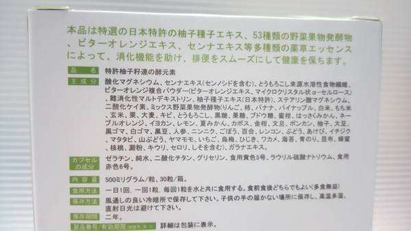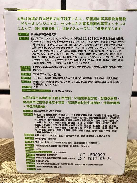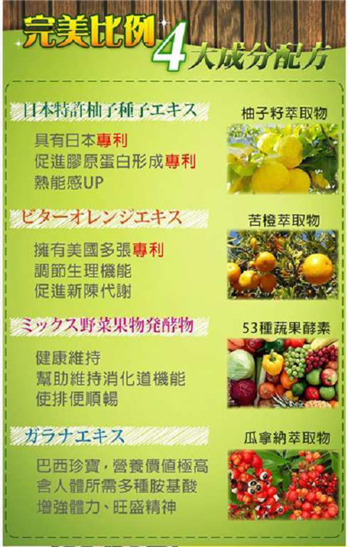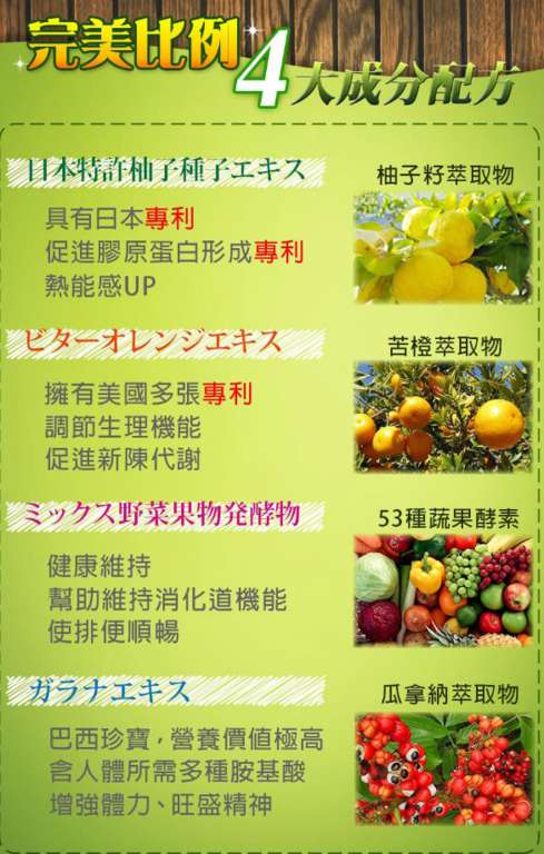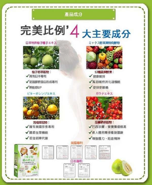 產品特選日本專利柚子種子萃取物、53種蔬果發酵物、苦橙萃取物、番瀉葉萃取物、瓜拿納萃取物等多種草本精華