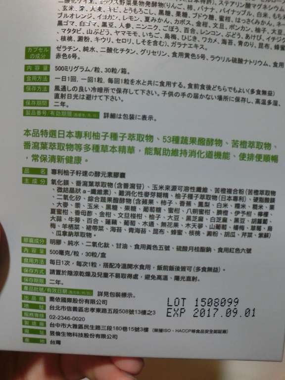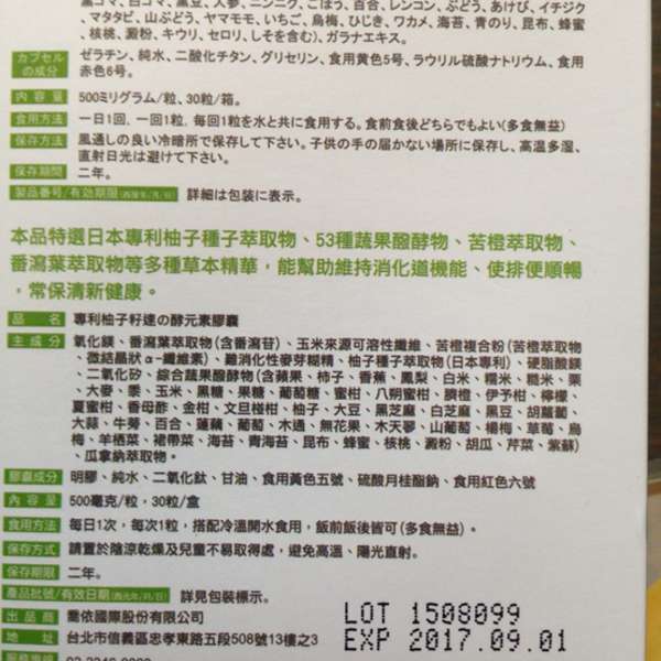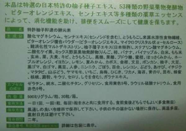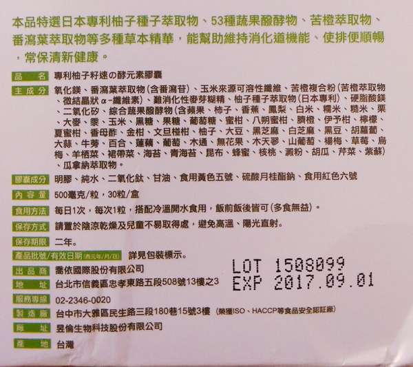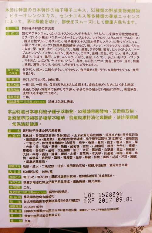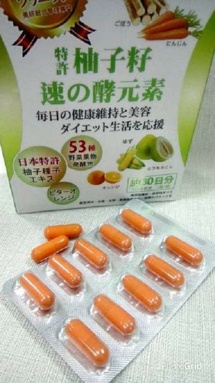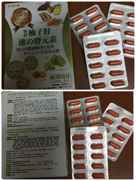 『柚子籽速の酵元素膠囊』主要是由柚子籽萃取、苦橙萃取、及53種蔬果酵素,