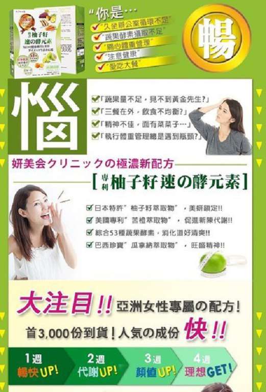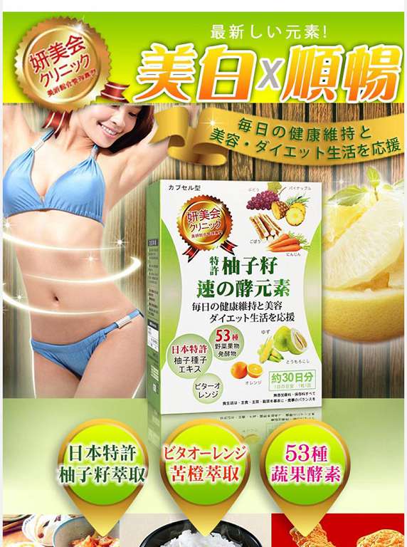 妍美会專利柚子籽速の酵元素膠囊它是目前日本最火紅的減肥話題,成份最夯的「柚子籽酵素」瘦身+美肌,不但要瘦還要瘦得漂亮