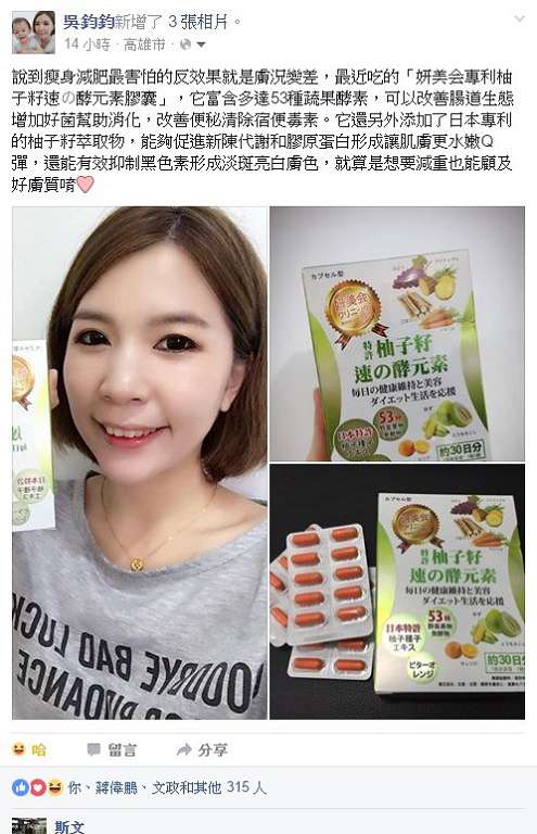 妍美会專利柚子籽速の酵元素膠囊它不但能夠幫助減重更加容易,還能讓膚質更加光采,身為愛美女性的我真的非常喜歡這樣的瘦身方式呢^^