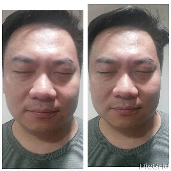 很明顯地感覺到有使用那邊(右邊)比較白,當然我不知道是不是有美白成分在@@ 經過詢問他的使用感受是有感覺臉部比較緊,真的有拉提效用,很驚訝 (廢話~男生都不愛擦保養品,有感受到效用當然覺得很驚訝...) 但是他的嚴重小皺紋可能要長期使用才能感受到改善吧~